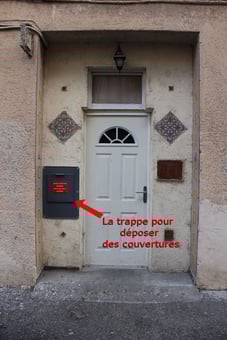 Si vous avez des couvertures en bon état dont vous aimeriez nous faire profiter, vous pouvez les déposez 24h/24 via une trappe dédiée à cela (voir la photo ci-contre) à notre local dont